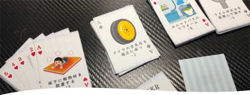 ・環境省が提供する家庭向けの温暖化対策診断サービス「うちエコ診断」の項目を、子供たちの行動によるCO2削減量順に「カーボンニュートトランプ」に置き換え、遊びながら楽しく学びます。